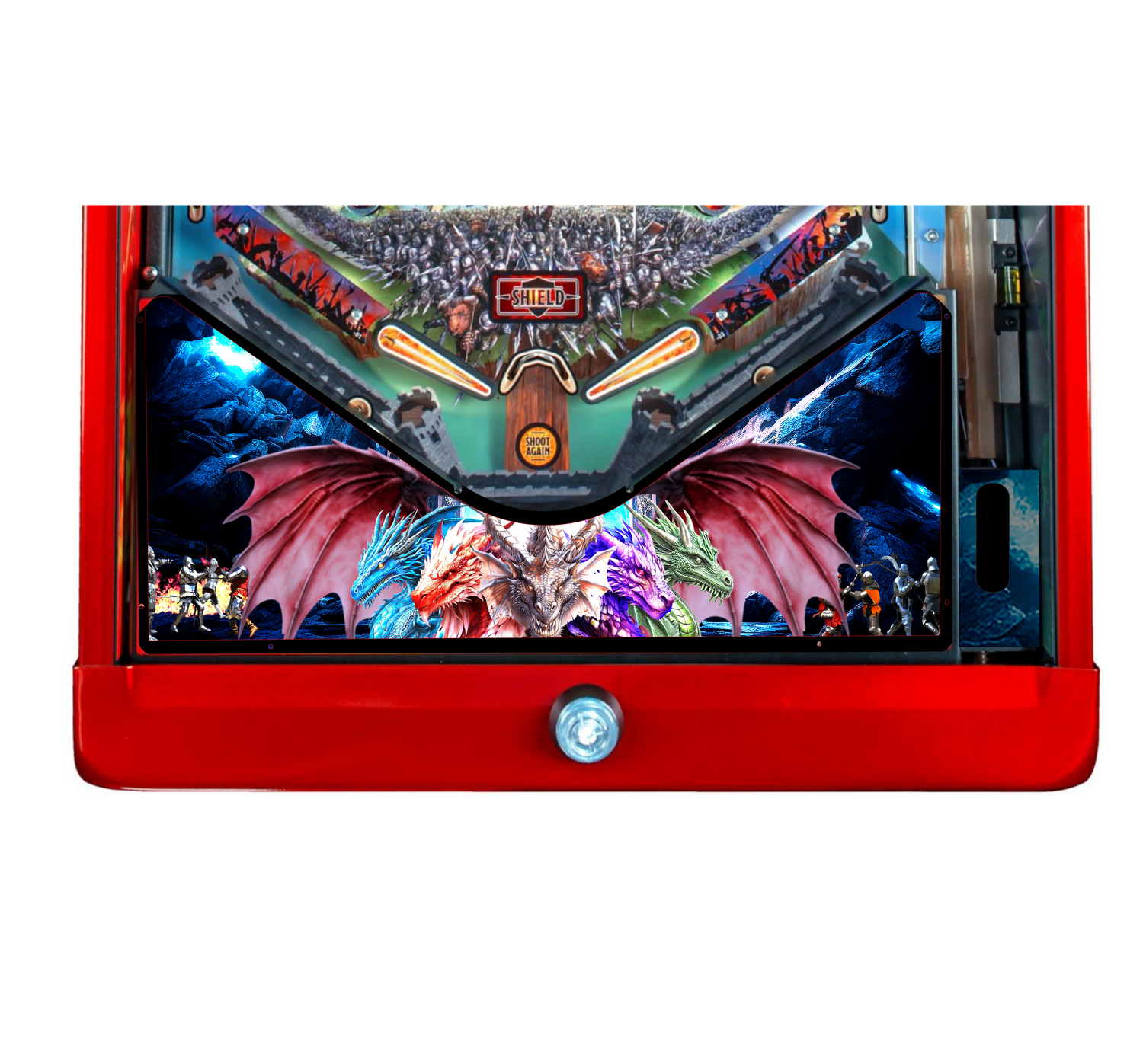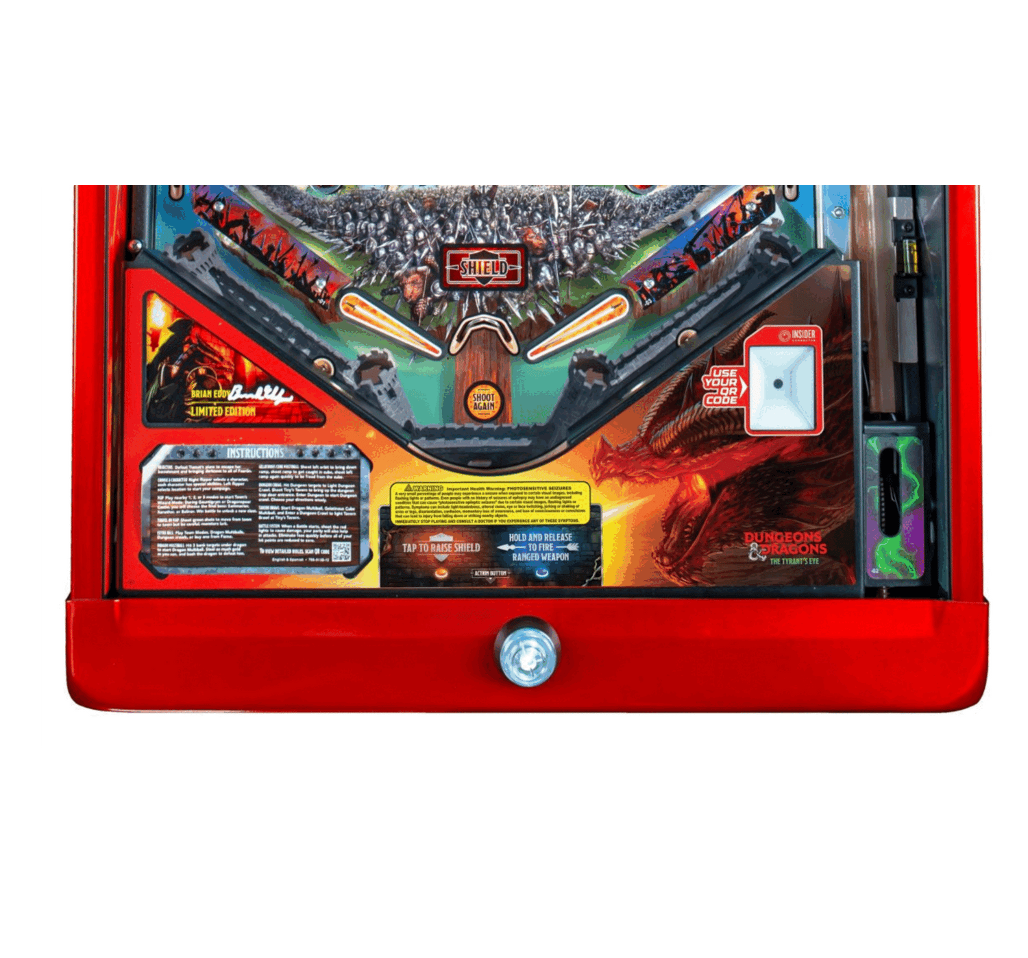 Elevate your pinball machine with the Dungeons and Dragons Pinball Five Dragons Lighted Apron, a striking replacement apron that lights up to bring the fierce dragon theme to life. This vivid, illuminated design includes a fully lit graphic, taking this area of your game up a notch. Crafted for durability and easy installation, the powder coated metal apron is outfitted with an artwork plexiglass insert that can be swapped out with additional designs. Optional QR code reader coin door mount also available for those with Insider Connected QR code readers.