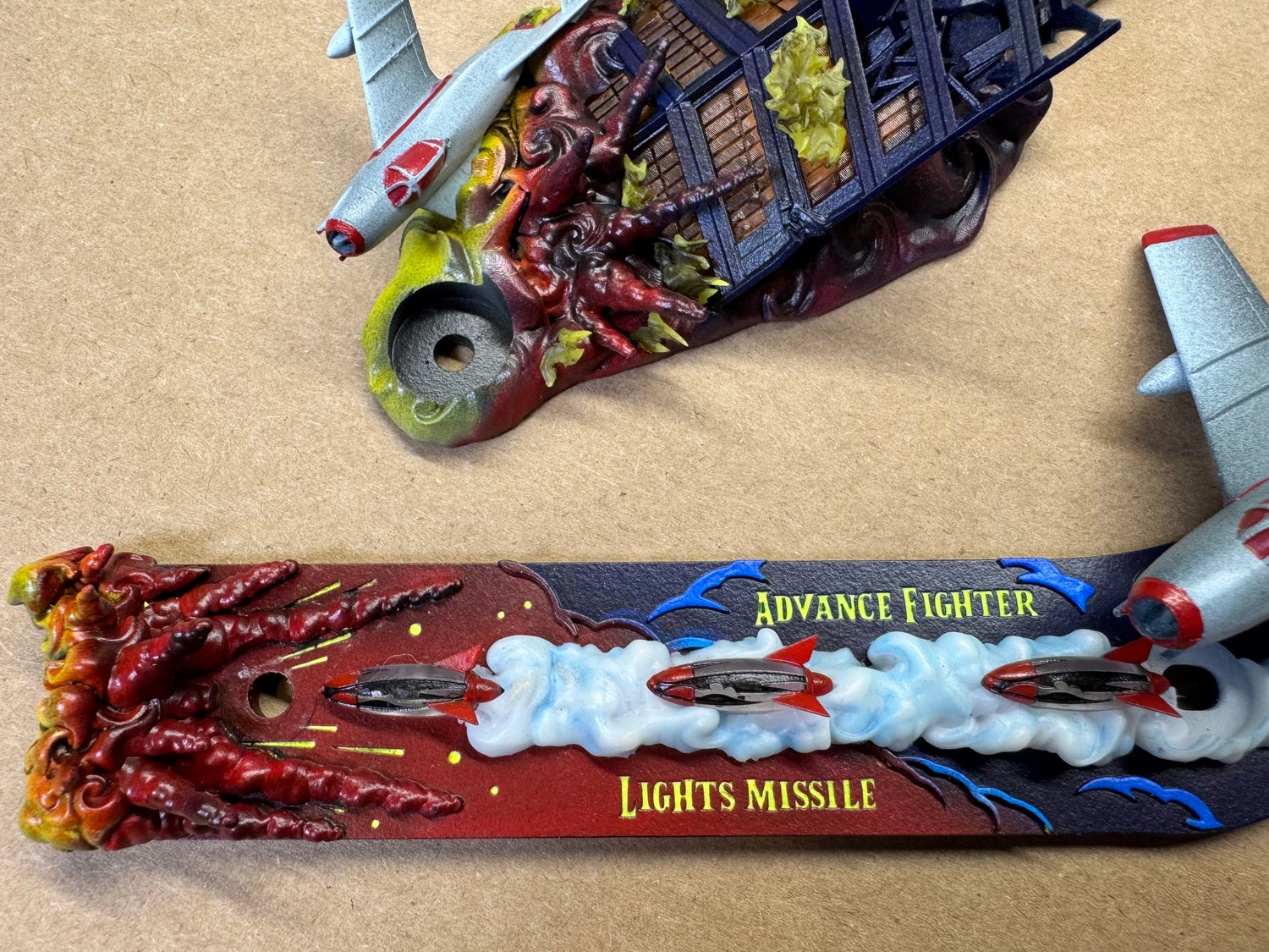 GODZILLA Slingshot and Return Lane 3D Collection - "RAMPAGE". Hand-painted custom skyscrapers and fighter jets replace flat plastics with dramatic 3D detail. Twisted girders, blown-out floors, and realistic flames create Godzilla's perspective towering over the devastated cityscape. Each building features 10 LEDs inside a diffuser lightbox—flames bounce, pulse, and shimmer. MIG-15 fighter jets advance through return lane guides with hand-painted clear resin missiles. Interactive lighting plugs into two separate GI sources under each slingshot for simple installation. Airbrushed and hand-painted with matte finish to match playfield art seamlessly. Includes: Left and right slingshot mods, left and right return lane guide mods, and 2 GI adapters (RED/WHITE). Compatible with all Godzilla Pro, Premium and Limited Edition models.